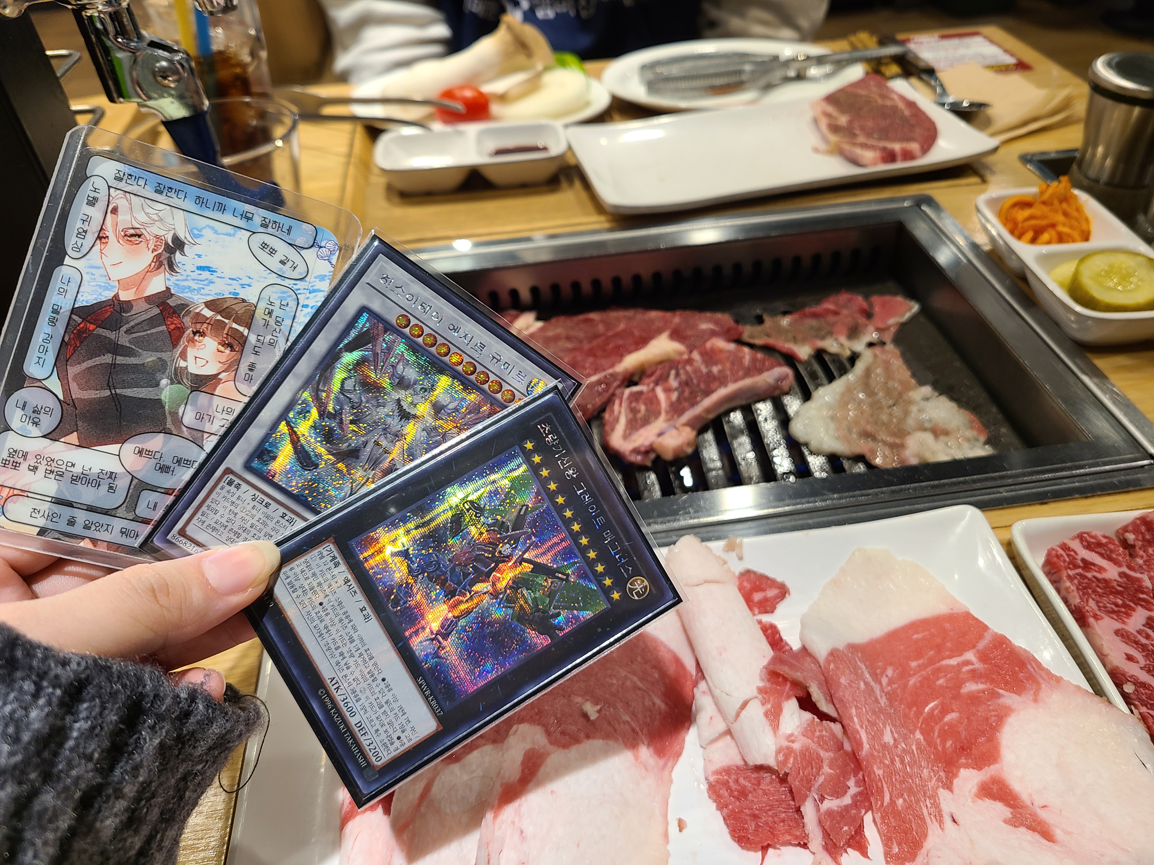그 후 포카도 뽑고 룸카페도 가고 놀았다가 엉터리고기? 흠.. 뭔가 하는 고깃집에서 저녁먹고 와펜하우스서 주머니도 만들어서 가진 포카 전부 수납했다